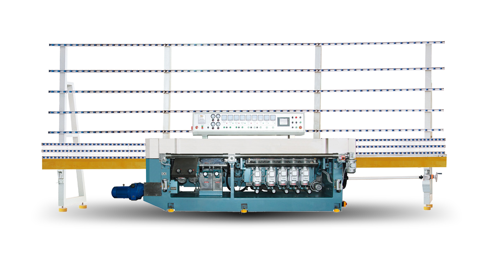 該機采用PLC控制,主要用于玻璃底邊及前大倒角磨邊及拋光,其中前面五個馬達(dá)角度在0°~45°間任意可調(diào),并在觸摸顯示屏上顯示角度及倒角寬度,自動磨削時可較準(zhǔn)確的調(diào)整和設(shè)置前倒角的各項參數(shù)。