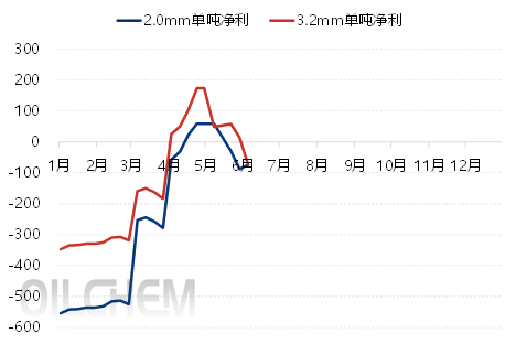 2025年2.0mm及3.2mm單噸光伏玻璃凈利走勢(元/噸)